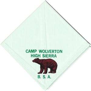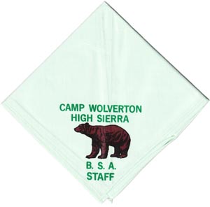 Final Neckerchiefs - These light green neckerchiefs were issued in 1974 or 1975. One of them says STAFF. The other three are slightly different from each other in that the brown in the bear varies from light to medium to dark. This was the last set of neckerchiefs made for Camp Wolverton. |