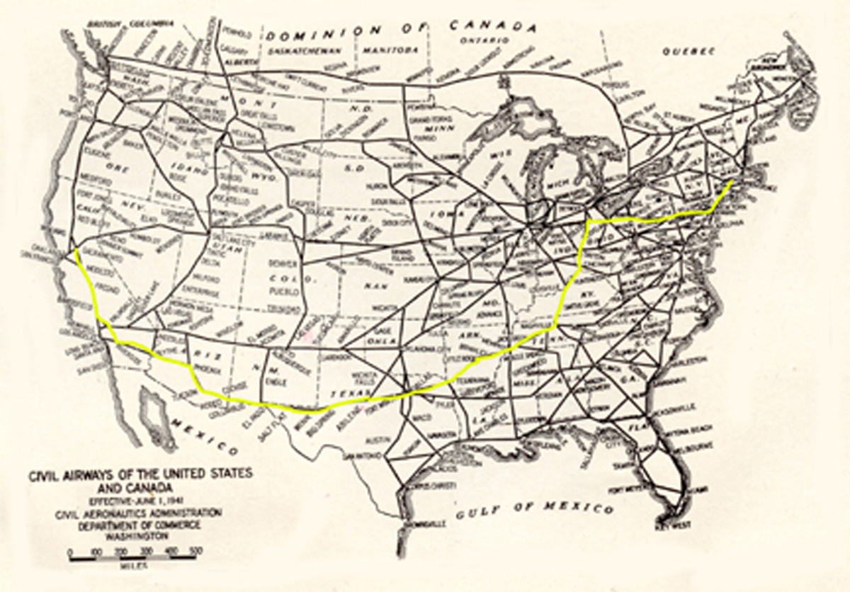Civil airways routes circa 1943. Route followed by 57th and 52 PGs marked in yellow