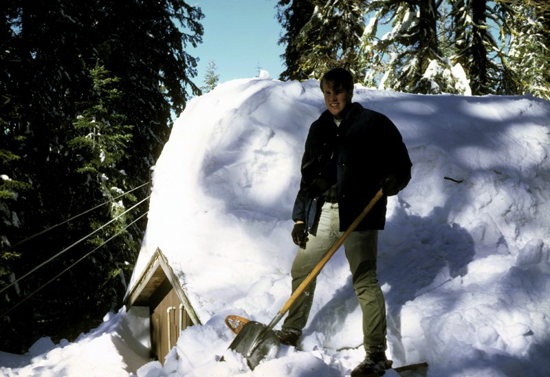 Jim Sleeper in a futile attempt to remove snow from the shower house roof in February, 1969