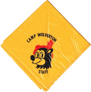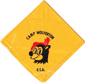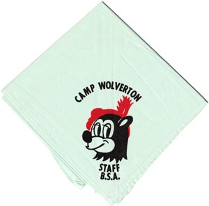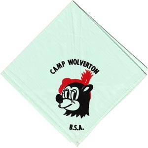 Early Silkscreened Neckerchiefs - These two light green, cotton, silkscreened neckerchiefs are from the mid 1950’s. They may be from about 1956, and may have lasted for more than one summer. There is also a possibility that they go back as far as 1954, since we know the Camp sold neckerchief slides that summer in the trading post, and we don’t know of any other Wolverton neckerchiefs prior to these. |