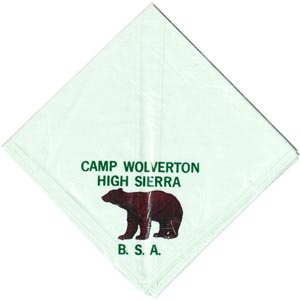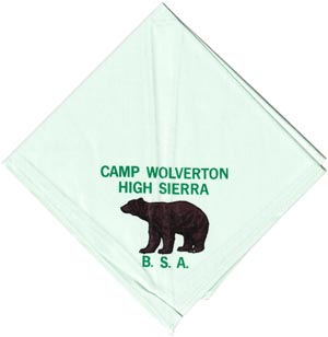 Final Neckerchiefs - These light green neckerchiefs were issued in 1974 or 1975. One of them says STAFF. The other three are slightly different from each other in that the brown in the bear varies from light to medium to dark. This was the last set of neckerchiefs made for Camp Wolverton. |