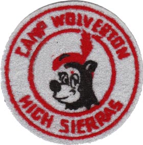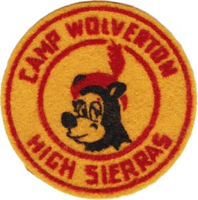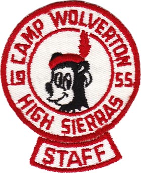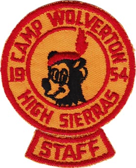 1954 This is the first year that a Camp Wolverton patch was embroidered on (gold) cotton twill. It is also the first year that there were no longer three colors of patches to signify camp-veteran status. And, this year started a three-year run of patches with the year on the patch. A matching gold staff segment (also known as a “rocker”) patch was issued for the camp staff. |